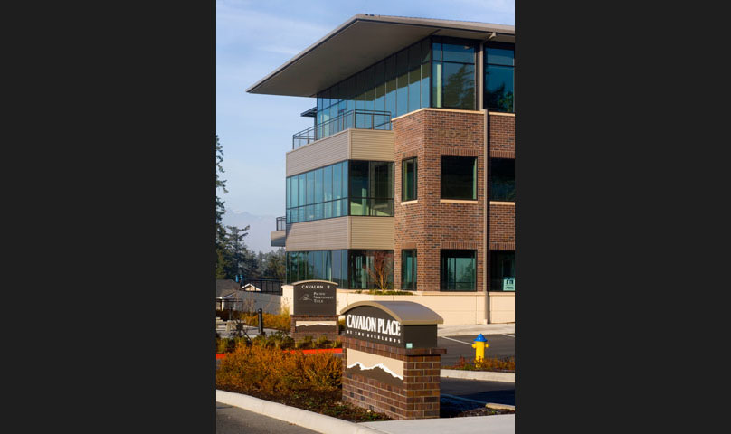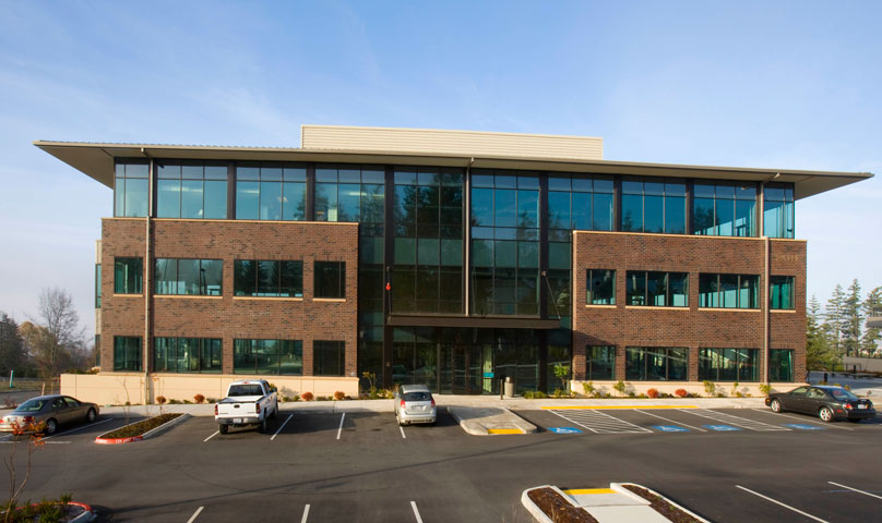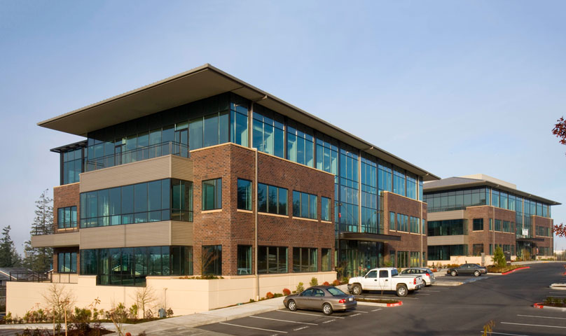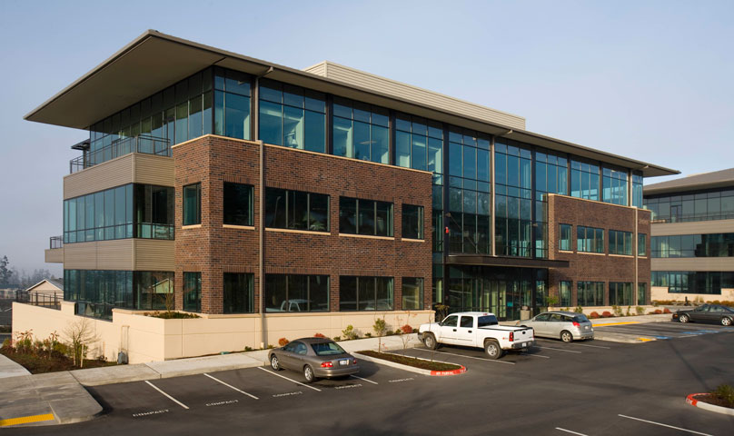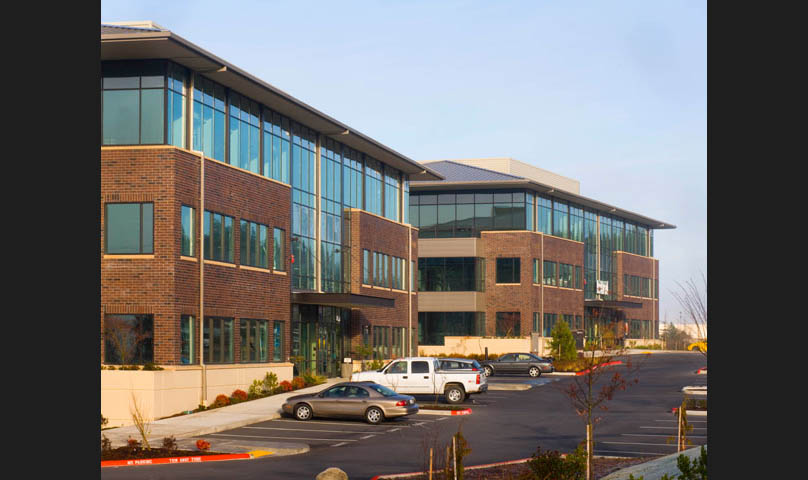 This project is located on an 8.5-acre site in Silverdale, Washington. The steep sloped site offers great views to the Dyes Inlet and the Olympic Mountains. The two Class 'A' office buildings provide office space on three floors over one level of below grade parking and are connected by a central plaza. The below grade structural system utilized conventional reinforced concrete walls and slabs while the main building structural system is steel. The cladding is made up of glazed curtain walls, brick, pre-colored pre-cast panels, punched windows and metal paneling. TWIST