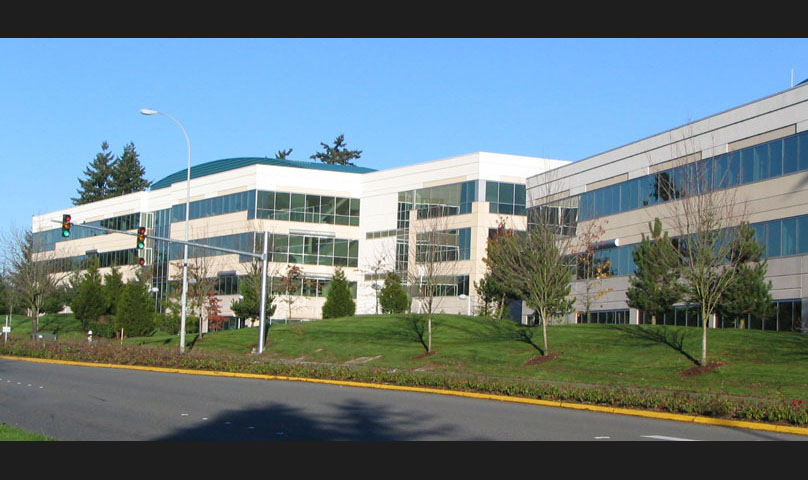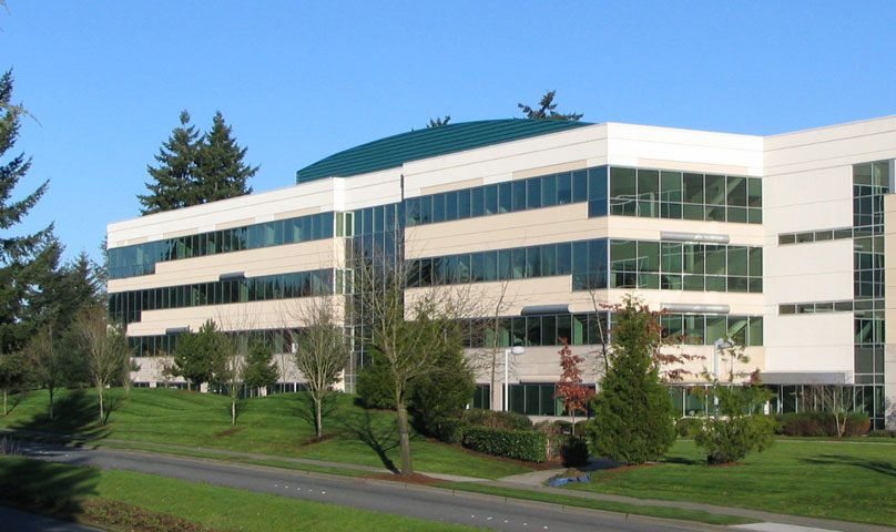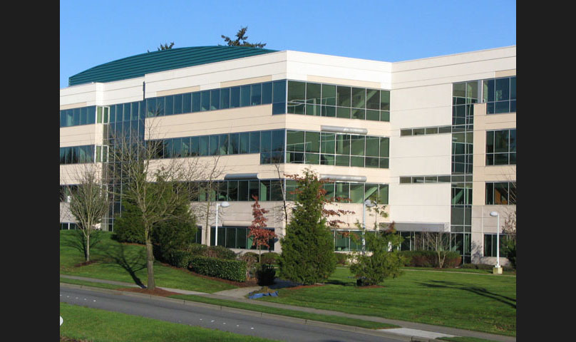 This office campus consists of one three-story building and three four-story buildings set over a composite below grade three-level parking structure. The buildings are constructed of steel with a combination of pre-cast concrete panel, EIFS, and ribbon window cladding. Curtain walls, metal panels, and canopies highlight the entry points. Site amenities include an on-grade elevated deck with colored concrete patterns and built-in planters that enable pedestrian circulation and landscaping.