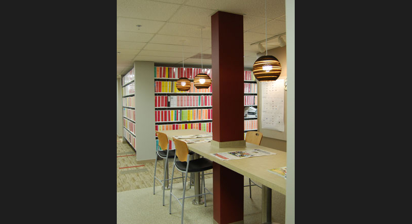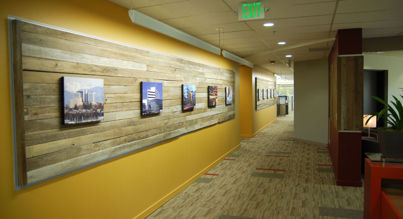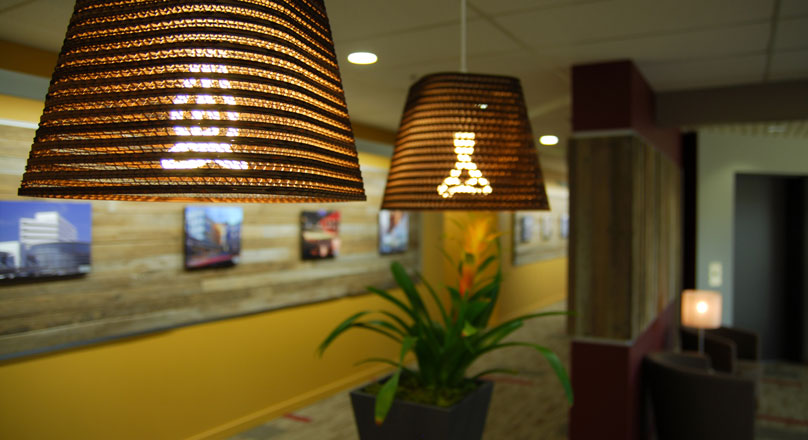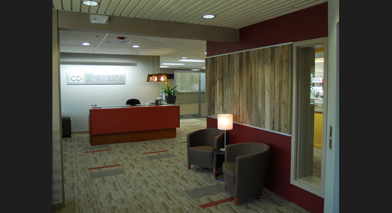 light, the plan came together quickly. CDi values design choices that are environmentally friendly, so TWIST utilized much of the existing furniture, lighting and cabinetry that could be salvaged from the existing space to create the new environment. The dynamic entry wall uses reclaimed grape stakes to add texture and interest. New light fixtures are made of recycled cardboard and use energy efficient Lumen lamping. The end result supports the CDi mission and brand and made the challenge of moving to new space a positive experience for the staff.