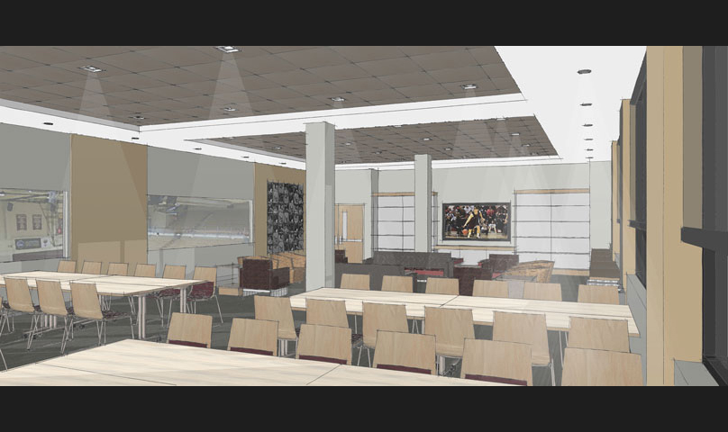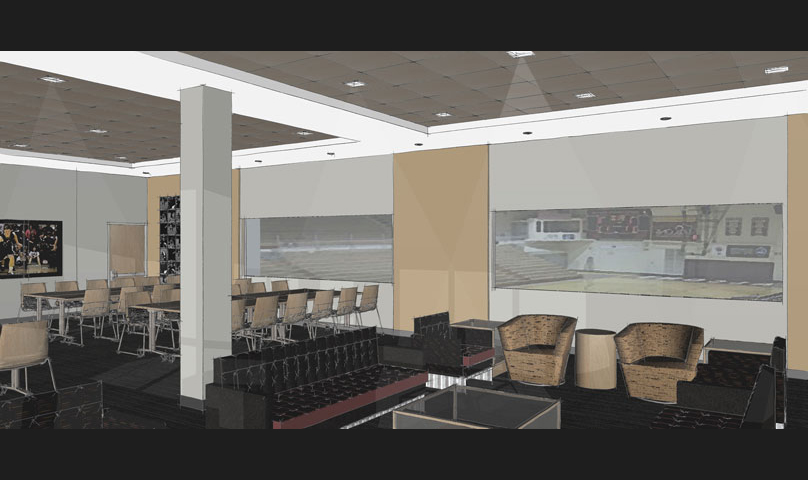 technology in the room was upgraded with large viewing screens, overhead audio, and there are new displays of athletic trophies and memorabilia collected in their many years of athletic successes.