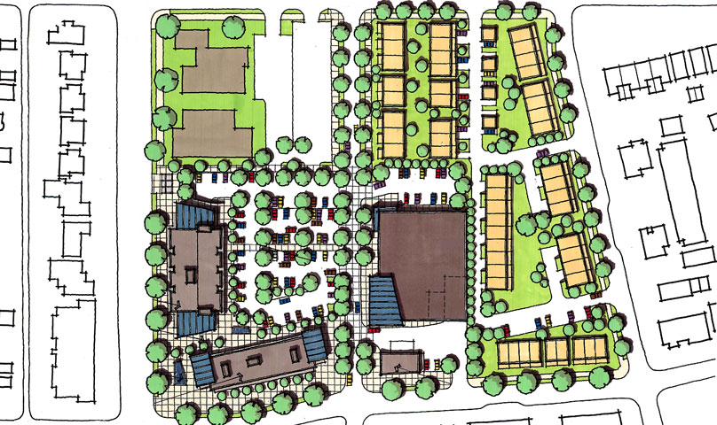This proposal is for a mixed-use development incorporating a grocery store, retail, offices and residential units to be located on a prominent site in the redeveloping High Point neighborhood in West Seattle. The buildings define the site perimeter in order to minimize the presence of the grocery and retail parking. The grocery store is situated at the center of the site, with its entry aligned to a proposed pedestrian walkway connecting to a corner gateway plaza. This walkway incorporates pedestrian-oriented