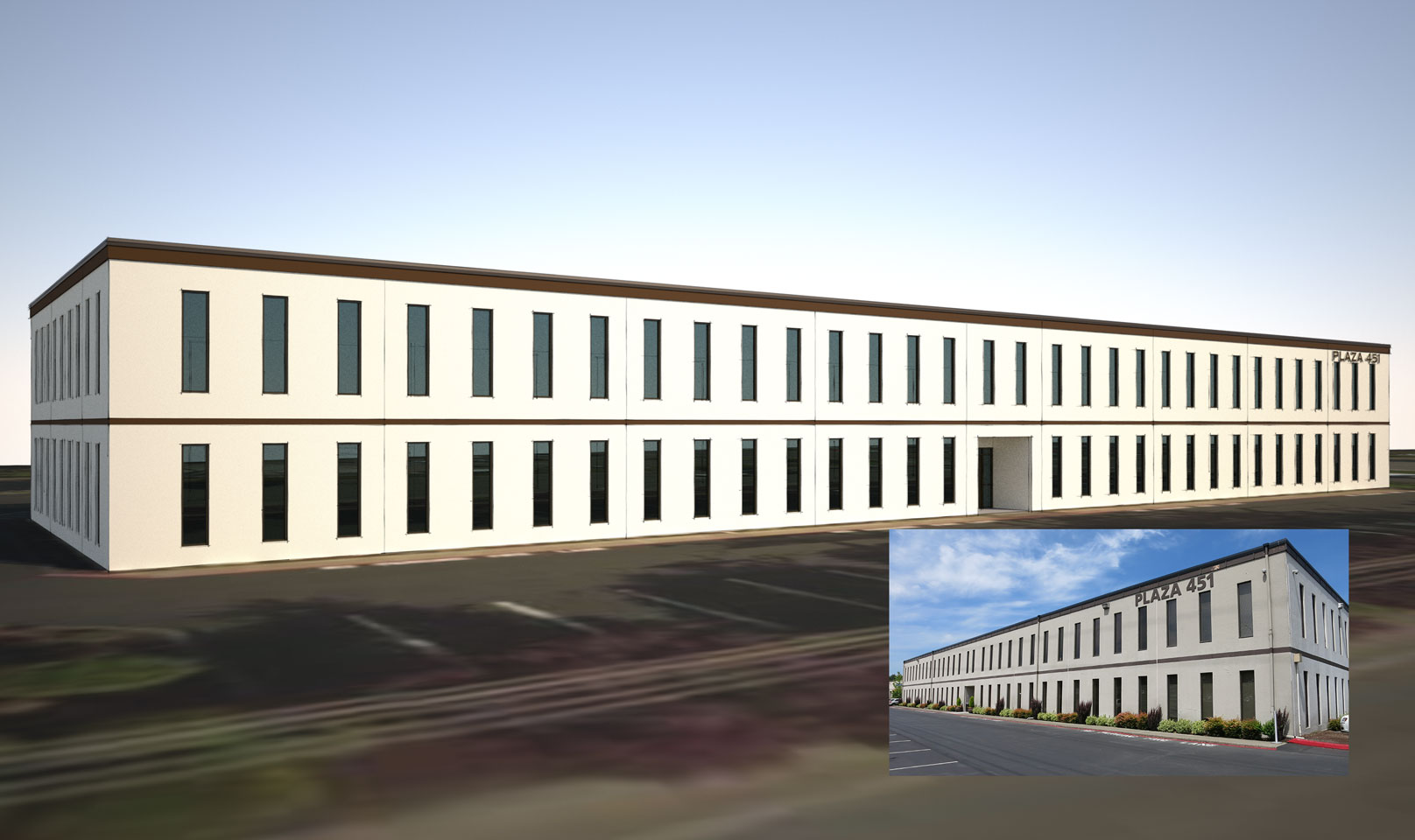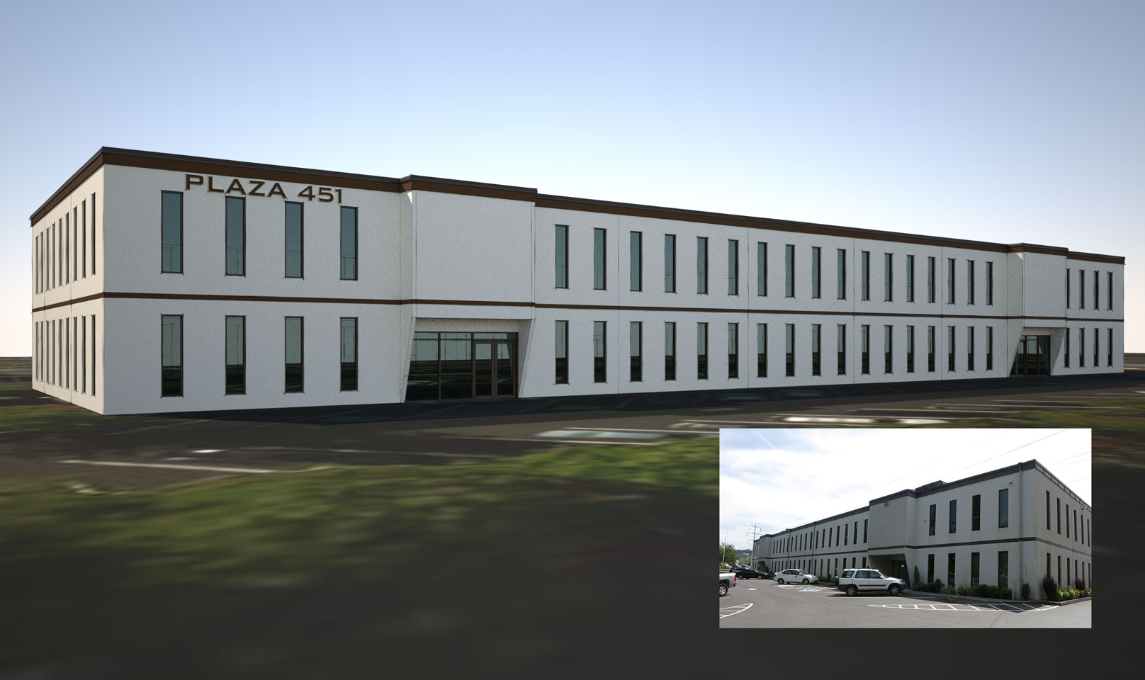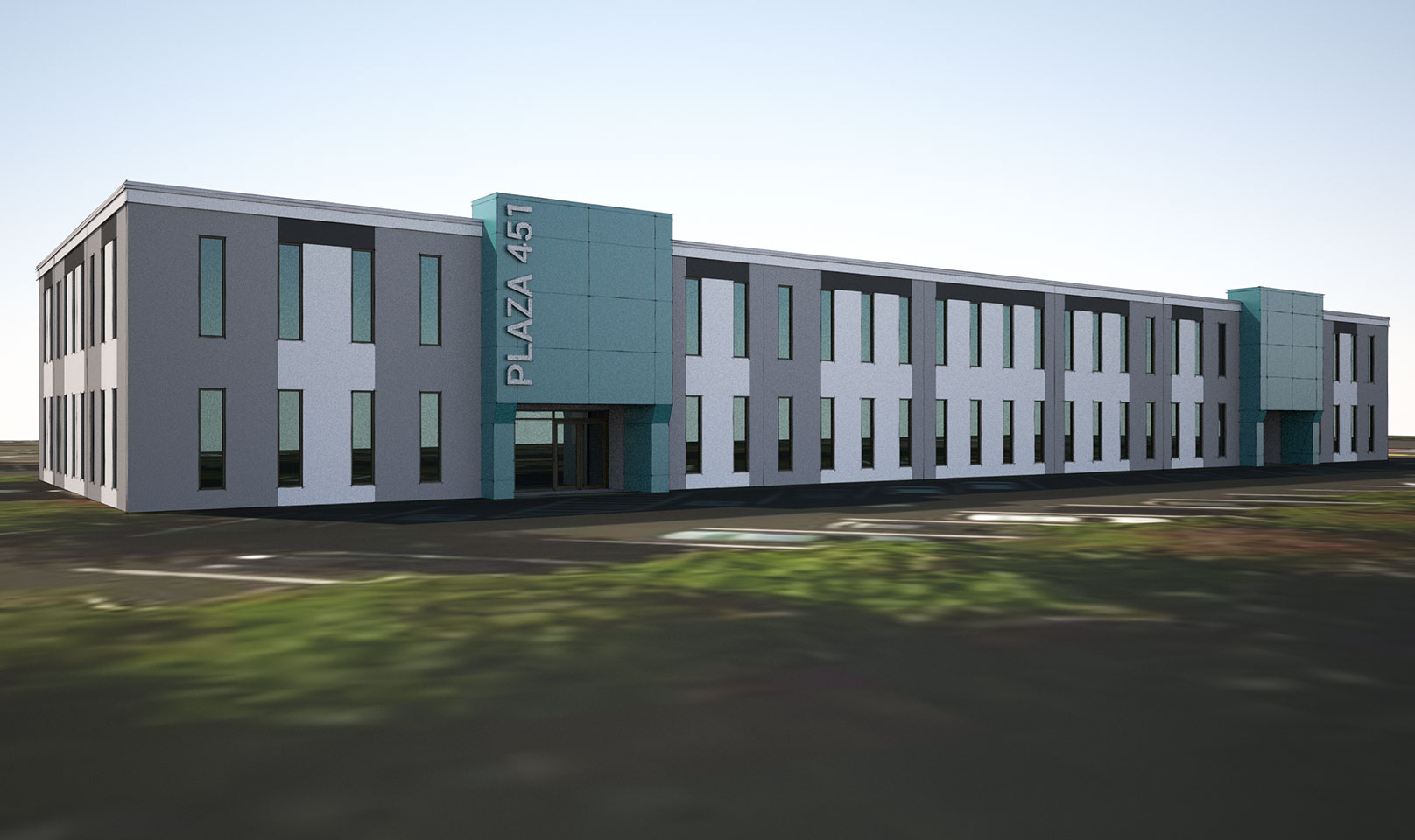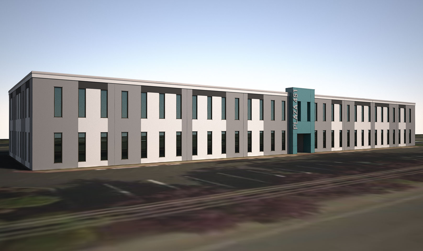 Plaza 451 is a class 'B' office and was ready for an update. TWIST looked at a variety of options with paint and new entries to update the look and feel of the building. Teal ACM panels and a grey tonal paint scheme will bring new life into this old concrete panel building.
