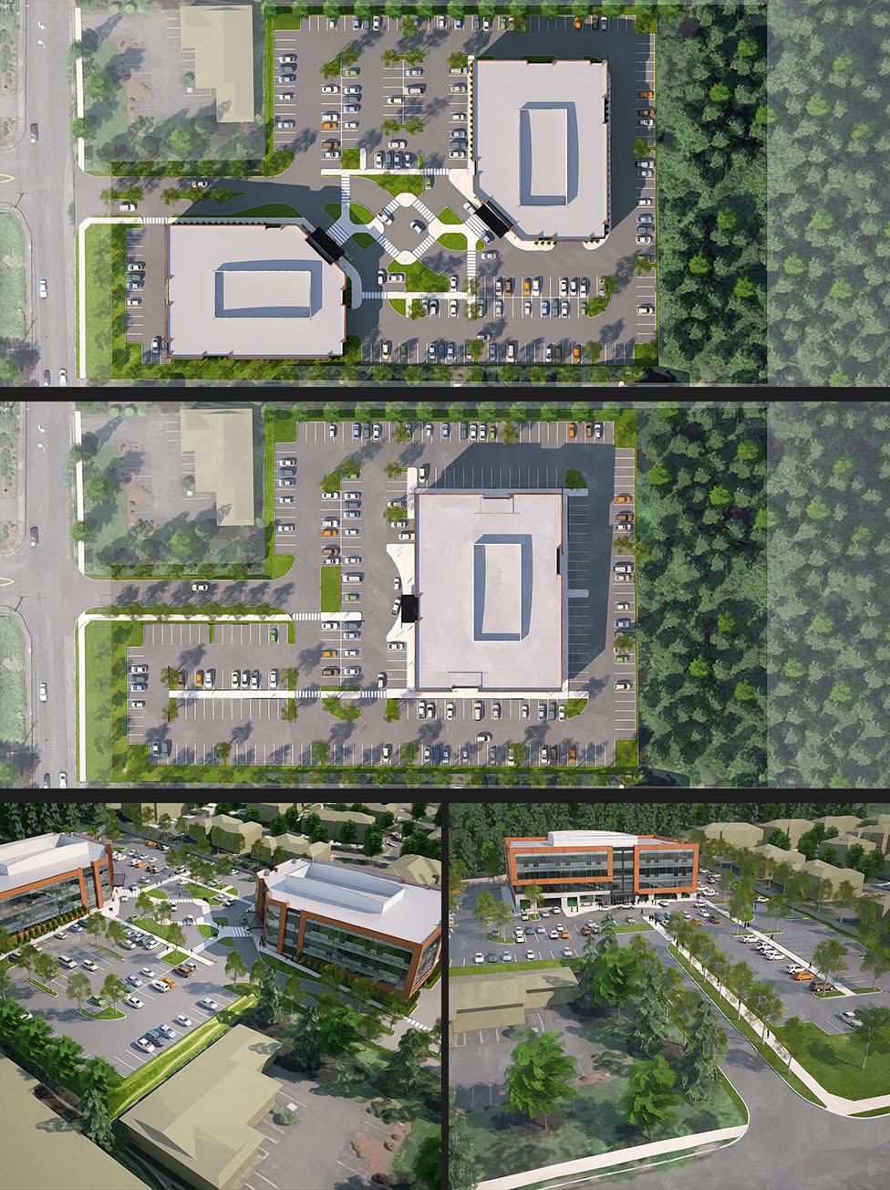 The effort shown on the right, is a study for a development company for a site in Renton, WA. We studied several building sizes and locations on the site, multiple arrival and parking scenarios. It was later used for the pre-application meeting with the City of Renton.